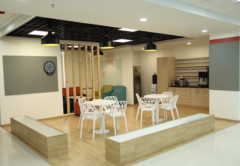 An open office concept with crisp white walls creating openness and an ambience for easy collaboration with informal break out areas .